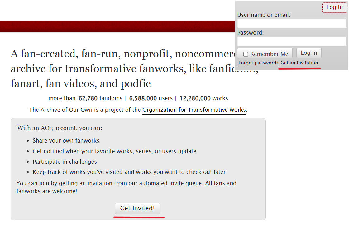 more than 62,770 fandoms | 6,587,000 users | 12,280,000 worksThe Archive of Our Own is a project of the Organization for Transformative Works.